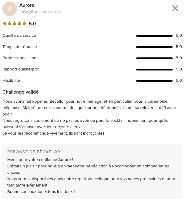 Ce mariage à Rocamadour a été pour moi une révélation : la musique, lorsqu’elle est choisie et interprétée avec soin, peut transformer la liturgie en un moment unique, profondément spirituel et inoubliable.